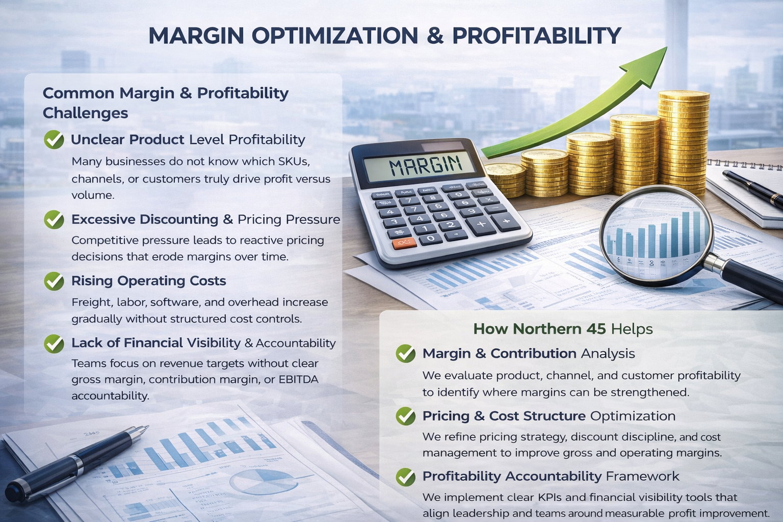 Margin optimization is one of the most overlooked drivers of long term business growth. Many companies focus heavily on revenue while ignoring pricing discipline, cost structure, and operational efficiency that directly impact profitability. Small improvements in gross margin, expense management, and contribution analysis can dramatically increase cash flow and enterprise value. Northern 45 helps businesses identify hidden margin leaks, refine pricing and cost strategies, and build a disciplined profitability framework that turns revenue into sustainable earnings.